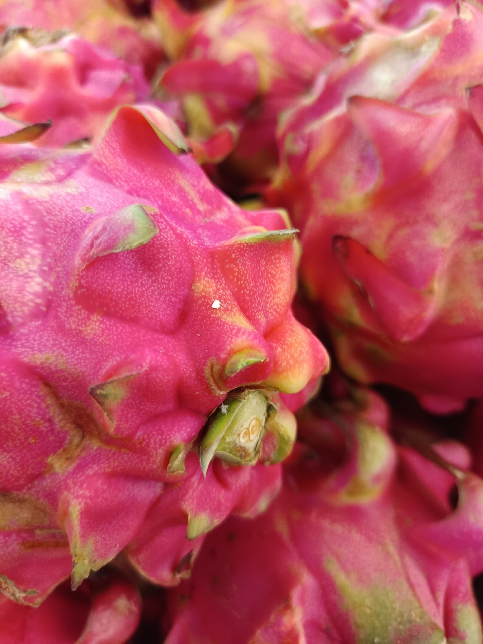 - "The image displays a tight, close-up view of multiple ripe dragon fruits (pitaya), filling the entire frame" by FM-PvkdH3, licensed under CC BY 4.0