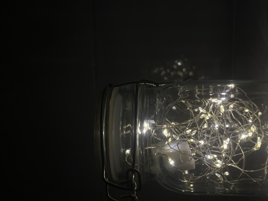A clear glass jar with a metal clasp lid is depicted in low light, positioned in the lower-left quadrant of the frame