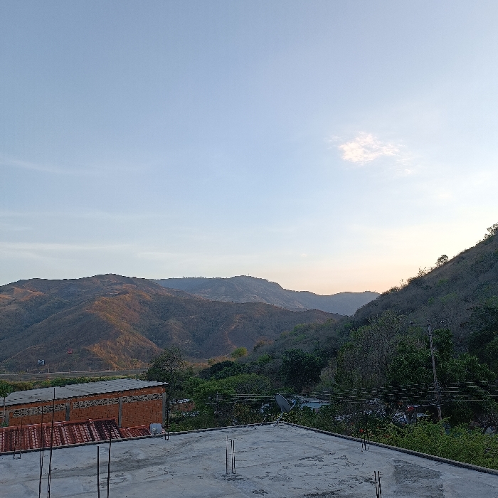 The scene depicts an outdoor environment in Trapiche del Medio, Venezuela, observed during either sunrise or sunset. In the immediate foreground, a flat, unfinished concrete roof occupies the bottom quarter of the image, from which multiple vertical rebar rods protrude. Behind this, to the left, a building with an orange-tiled pitched roof is visible. Adjacent and slightly behind it, a longer building features exposed reddish-brown brick walls and a dark grey corrugated roof. To the right of these structures, amidst dense green vegetation, a white, circular satellite dish is mounted. A valley filled with green trees and brush separates these structures from the distant mountains. A road or highway, marked by faint structures, traverses the valley floor in the mid-left. The background is dominated by a series of undulating mountains and hills, densely covered with dry, brownish vegetation. The sky is a clear gradient, moving from light blue directly overhead to a faint orange and pink tint near the eastern horizon, with a singular wispy white cloud in the upper right quadrant. No individuals or specific activities are observable within the frame.