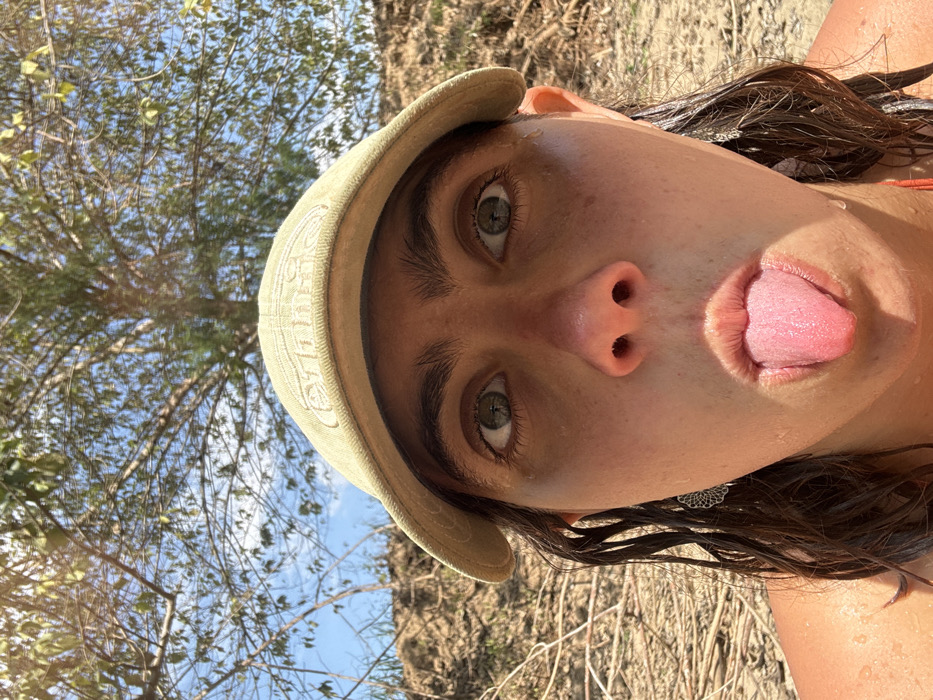 A woman with damp, dark hair and a tan hat angled upward poses in a playful selfie. She sticks out her tongue, displaying its pink texture. Her eyes are wide and slightly green. The background shows a combination of trees with sparse leaves against a bright sky and what appears to be a sandy bank. The image is rotated.