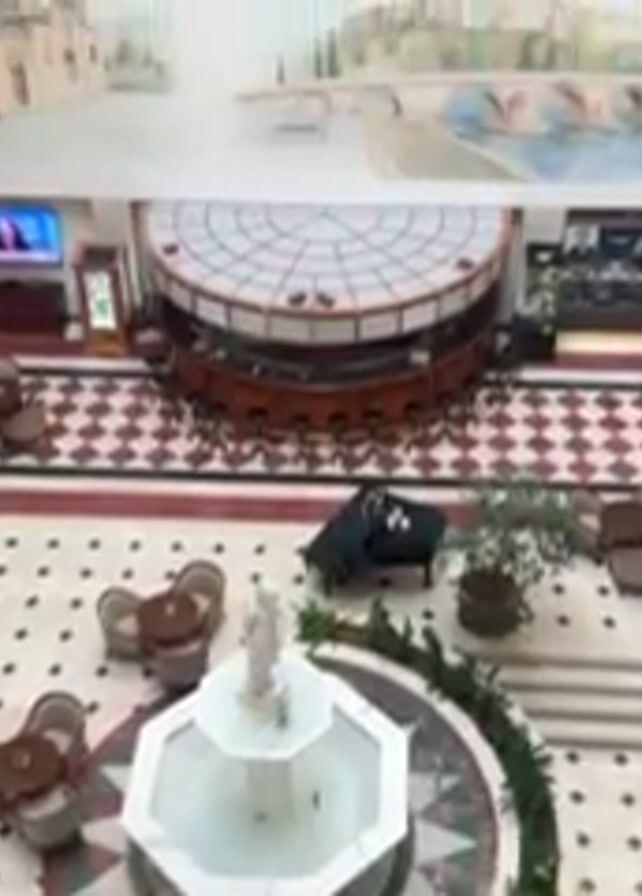 n overhead view of the interior of a building, possibly a hotel lobby. The ground floor has a checkerboard pattern in red, black and beige. There is a fountain in the center surrounded by chairs and tables. There is a circular bar at the back with a piano nearby. Lounge chairs are scattered around. A mural of buildings and landscapes adorns the tall walls. Balconies with arched openings surround the upper floors and a skylight illuminates the scene. The camera pans upwards to showcase the full mural and the architecture.