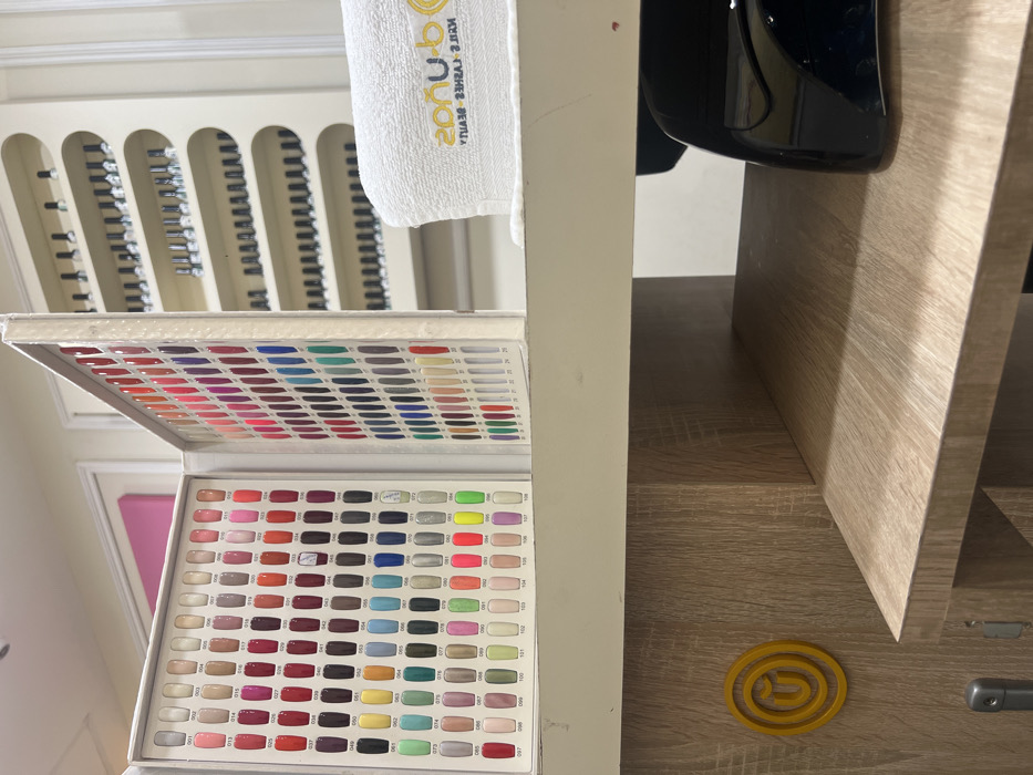 A salon setup presents an array of nail polish colors arranged in a multi-tiered display. Above, shelves house nail files or tools. A white towel with "zonu" branding and a professional nail lamp are visible. Below, a wooden cabinet with its door ajar, revealing a yellow, round sticker and a silver knob. Select nail polish colors are labeled with numbers.