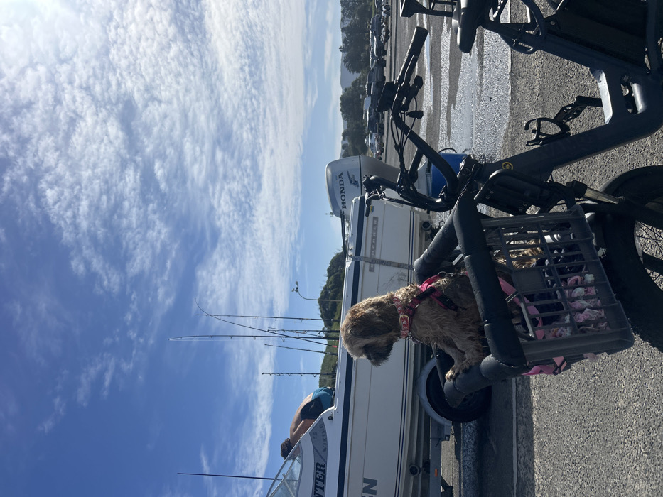 A dog sits in a basket on a dark-colored bicycle. The bike is parked near a boat on a trailer. The boat has fishing rods and a Honda motor. A person is bending over the boat. The sky is blue with puffy clouds. Cars are parked in the background.
