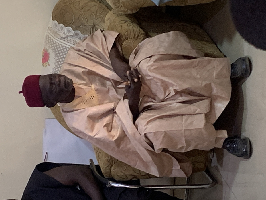 This image depicts an indoor scene in Akwanga, Nigeria. An elderly male with dark skin is seated centrally on a patterned, light brown upholstered sofa. He wears a flowing, light tan traditional garment featuring a lighter, patterned neckline with cut-out details, and a dark red traditional cap. His hands are clasped and rest on his lap, and he looks towards his right. He wears dark dress shoes. Behind him, draped over the sofa back, is a white crocheted doily with a floral pattern. To the left of the central figure, a second individual is partially visible, seated on a chair with a metallic frame, wearing a dark, short-sleeved garment. In the background, a white object, possibly an appliance, is visible along with a small red item. The walls are light-colored, and the floor appears to be a light tone. The lighting suggests an interior setting with artificial light.