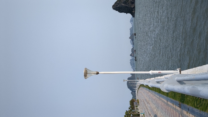 The scene depicts a waterfront promenade in Ha Long Ward, Vietnam, overlooking Ha Long Bay. In the immediate foreground, a light grey concrete railing extends horizontally along the right edge, bordering a body of dark grey-green, choppy water. A white lamppost, featuring a clear, bell-shaped or conical light fixture, stands prominently on this railing in the center-right of the image. To the left of the railing, a narrow strip of green grass precedes a paved promenade, constructed from multi-colored interlocking pavers (reddish-brown, grey, light grey), which curves gently to the left and recedes into the distance. Several palm trees are visible lining the far left edge of the promenade. In the middle ground and background, numerous dark, steep limestone karst islands and islets rise dramatically from the bay, characteristic of the Ha Long Bay landscape. Several small, dark-hulled boats are observed navigating the waters among these islands. The sky above is a pale, hazy blue, indicating clear conditions. No individuals are visible within the frame.