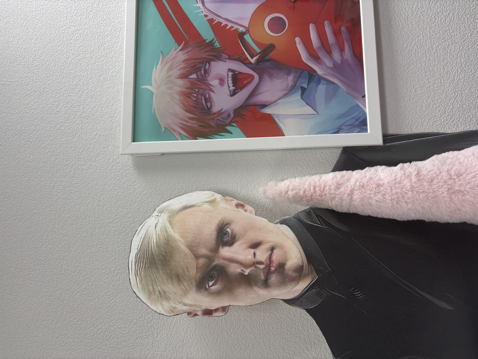 - "A framed anime-style portrait featuring a character with blonde hair and a prominent tongue is mounted above a cutout of actor Tom Felton as Draco Malfoy" by FM-08PzB2, licensed under CC BY 4.0