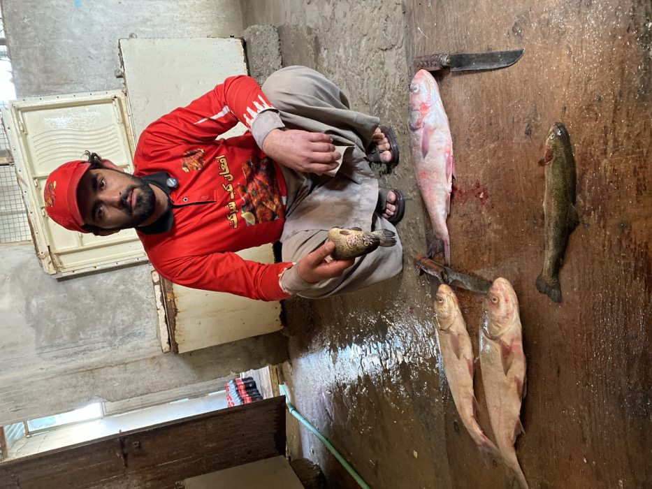 The image depicts a male individual squatting in an industrial-style indoor space within Deh Sabzi, Afghanistan, surrounded by fish and processing tools