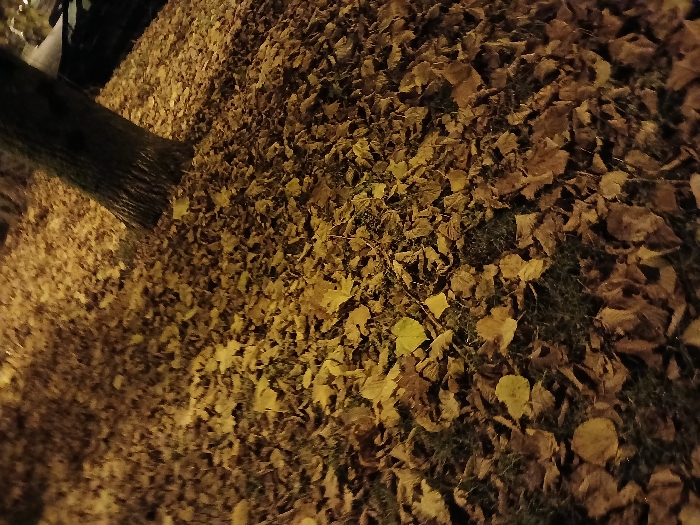 - "A close-up, low-angle view shows a ground covered in fallen leaves, illuminated by dim, warm light" by FM-4kXs22, licensed under CC BY 4.0