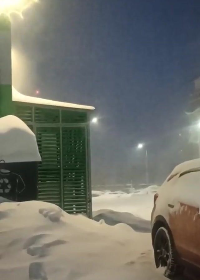 snowy scene during what appears to be the early evening or late afternoon. Snow is falling heavily, partially obscuring the view. An orange car, partially covered in snow, is parked on the right. Next to the car is a green structure which is also laden with snow. A street light is visible above and behind the structure. In the distance, beyond the structure, what looks like a parking lot with additional snow-covered vehicles is visible. A streetlight is also visible in the distance. The sky is a dark blue.