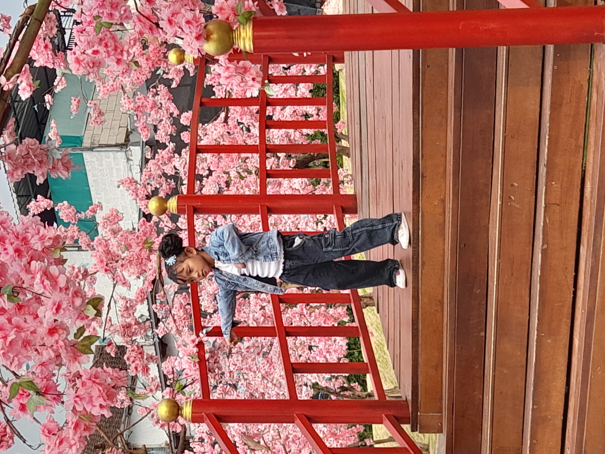 - "A child in a denim jacket and dark pants lies on a red ladder-like structure, seemingly posing amidst artificial cherry blossoms" by FM-8CAHW2, licensed under CC BY 4.0