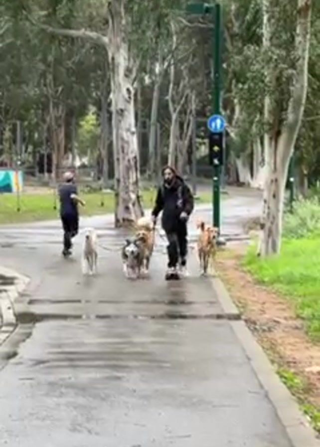 - "man riding a skateboard, walking five dogs on leashes on a wet, gray asphalt path" by FM-Vq3LF2, licensed under CC BY 4.0