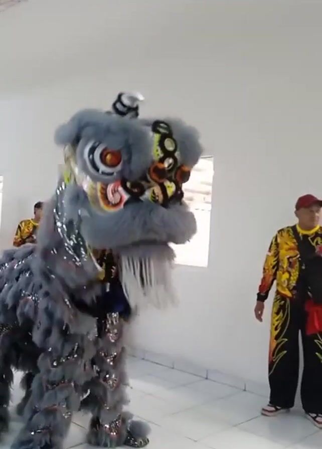 In a well-lit room with white walls and tiled floors, a traditional Chinese lion dance costume in shades of gray and silver is being maneuvered by two performers