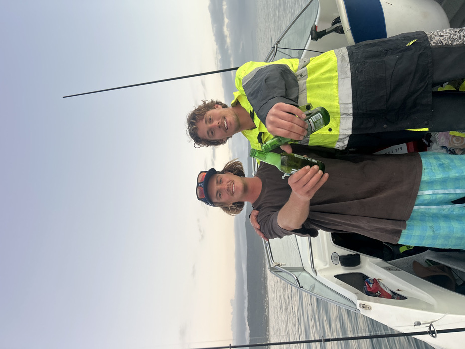 Two young men stand on a boat, each holding a green glass bottle. The man on the left wears a bright yellow safety jacket with gray accents and black shorts. The man on the right sports a brown long-sleeved shirt, turquoise and blue plaid shorts, and a cap. A fishing rod extends from the bottom of the frame. The background features a body of water, and a mountainous landscape is visible in the distance under an overcast sky.