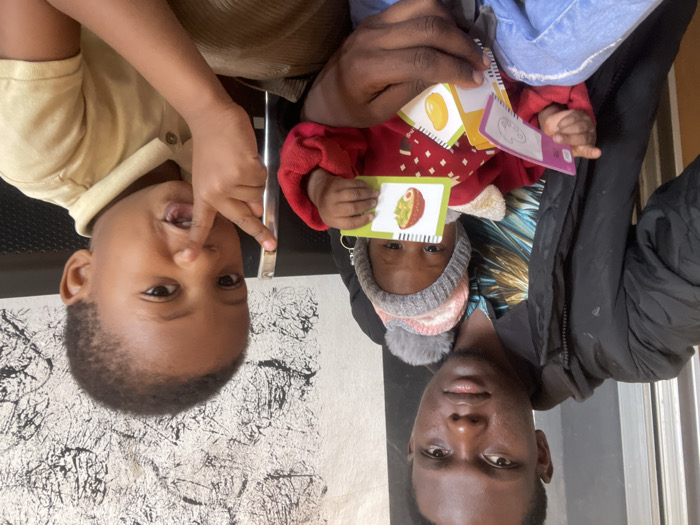 A mid-shot photograph displays three individuals indoors, reportedly within the city of Jos, Nigeria. On the left, an adult male with a dark complexion and short dark hair wears a black zip-up jacket over a patterned collared shirt. He looks directly forward with a neutral expression. Seated on his lap is an infant, dressed in a red long-sleeved top with a light design, light blue jeans, and a grey and pink knitted hat with a pom-pom. The infant holds and looks down at several colorful flashcards, one prominently featuring a red and green fruit, and another an egg. To the right, a young child with a dark complexion and short dark hair wears a light yellow polo shirt. This child has an open-mouthed expression, showing teeth, and holds two fingers of their right hand near their nose, looking towards the viewer. The background consists of a plain light-colored wall behind the adult male and a large piece of abstract artwork featuring black scribbled patterns on a white background behind the young child. A metallic chair component is visible between the infant and the young child.