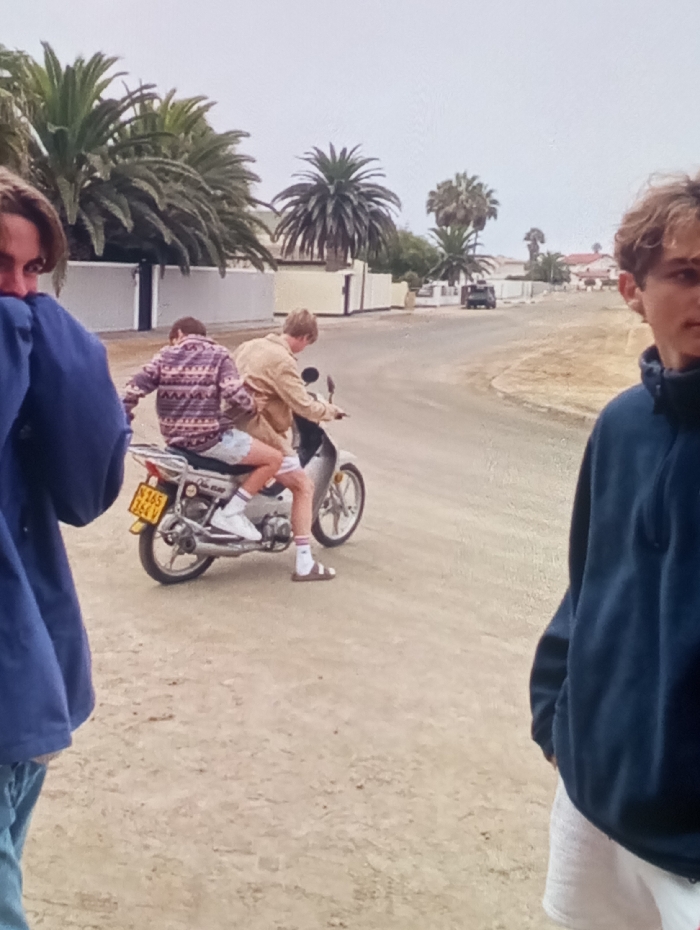 The image depicts three young males in an outdoor, unpaved residential environment, with a fourth male partially visible. Two males are positioned on a silver-colored scooter in the mid-ground. The rider, facing right, wears a tan jacket, light shorts, white socks, and brown sandals. The passenger, seated behind the rider, wears a patterned long-sleeved shirt, light shorts, white socks, and white sneakers. The scooter displays a yellow-and-black license plate, "N 165 264 V," on its rear fender. To the left in the foreground, a male with dark hair is partially visible, wearing a dark blue top and jeans, with his left arm raised, obscuring part of his face. To the right in the foreground, a male with light brown, wavy hair wears a dark blue quarter-zip fleece top and light-colored shorts, looking directly forward. The environment features a light brown, dusty, unpaved road that curves into the background. Numerous tall palm trees are prominent in the mid-ground and background, behind several single-story residential buildings with light-colored walls and low perimeter fences. A dark vehicle is visible in the far background on the road. The sky is overcast and light grey. The visual evidence, specifically the numerous palm trees, arid landscape, and the "N 165 264 V" license plate format, which is consistent with Namibian vehicle registration, does not align with the specified location of Riga, Latvia, but rather suggests a location in a different geographical region, likely Namibia.