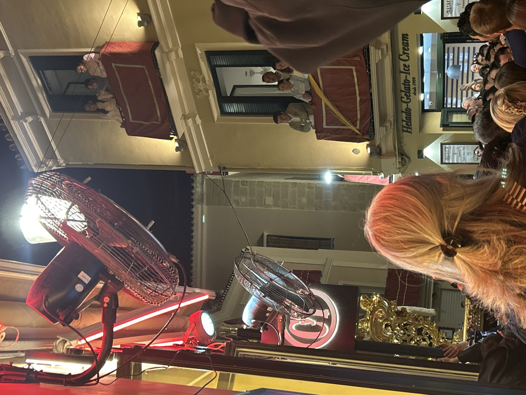 Here is a detailed description of the image: The image appears to be taken during a nighttime event, possibly a religious procession or festival, in what seems to be the city of Málaga, Spain. The photograph is captured from a low angle, looking upwards at a street scene. Several groups of people are visible looking down from windows and balconies of the buildings lining the street. The balconies are adorned with red decorative coverings. To the right, a crowd of people is gathered, some of whom appear to be looking at something out of view of the camera. A storefront with the words "Helado-Gelato-Ice Cream desde 1999" is also visible to the right. In the foreground, there are two electric fans positioned on a structure, possibly a platform or float. There is also a bright, small floodlight and red neon lighting. The upper part of a golden, ornate structure is also visible, suggesting it could be part of a ceremonial float. A person with blond hair and a ponytail is positioned near the golden structure.