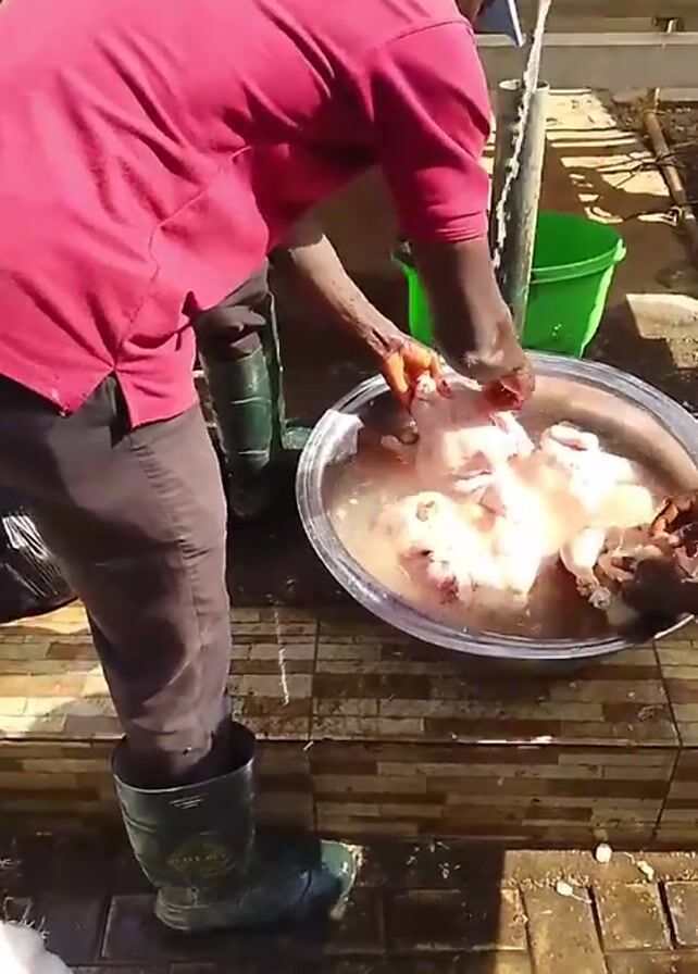 The video depicts two men cleaning raw chicken in a large silver bowl filled with water