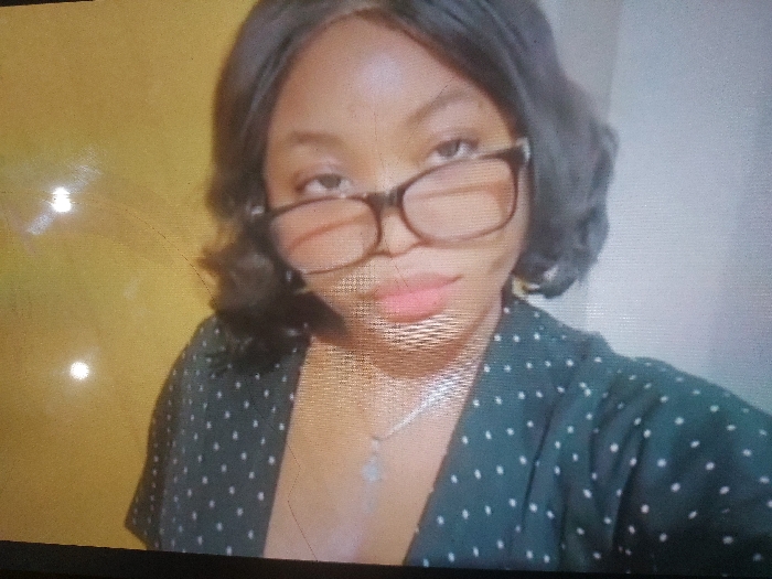 A woman with short, dark hair poses for a selfie. She's wearing glasses and a dark polka-dot shirt. A delicate necklace with a pendant rests on her chest. The background is a mix of yellow and white walls. The image quality appears to be slightly grainy.