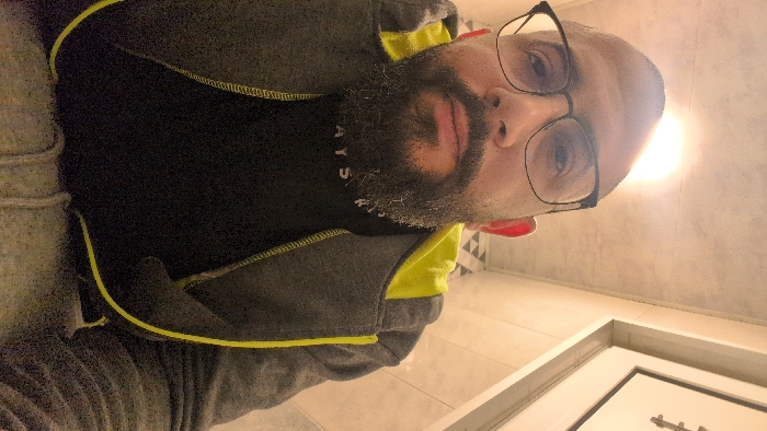 An adult male subject is depicted indoors in Oreshak, Bulgaria, captured from a low-angle perspective, consistent with a selfie