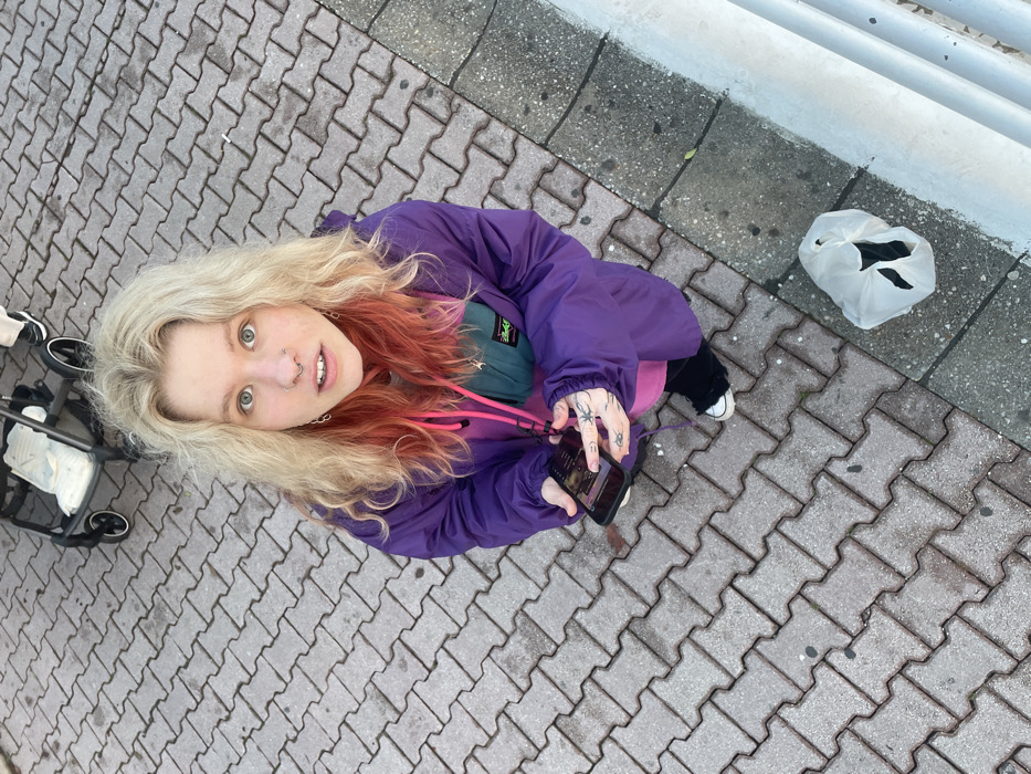 The image captures an outdoor scene in Herceg Novi, Montenegro, featuring a young female looking directly upwards into the camera. She has wavy blonde hair with pink/reddish dyed ends and green eyes. Facial piercings include a silver septum ring and a stud in her left nostril, complemented by small silver hoop earrings. Her expression is one of mild surprise or inquiry, with her mouth slightly open. She wears a purple hooded jacket over a visible pink garment and a dark teal top featuring a white graphic on the chest. Both hands display tattoos, with spider-like designs visible on the right hand and various symbols on the left. She holds a black smartphone horizontally with both hands, its screen illuminated, displaying an application interface consistent with a music player or social media feed. Her footwear consists of black fuzzy leg warmers over white sneakers, likely Converse-style. In the upper left background, a black and white baby stroller with light-colored bedding is partially visible, along with the feet of a person in black and white sneakers. In the lower right foreground, a white, semi-transparent plastic bag containing a dark object rests on the ground. The environment consists of a paved surface made of reddish-gray interlocking concrete pavers arranged in a herringbone pattern. To the right, this paving transitions to a darker gray concrete surface, delineated by a white painted line. Two horizontal white metal bars, possibly part of a railing or fence, are visible in the far lower right corner. The lighting appears soft and even, suggesting an outdoor setting under overcast conditions or during twilight.