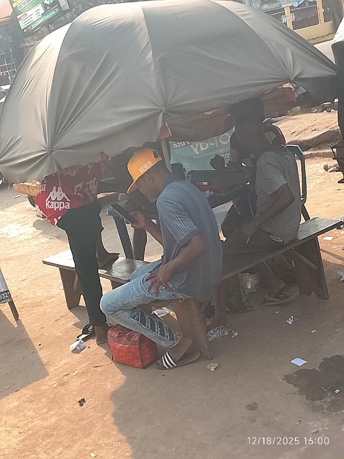 A group of men are seated under a large, light-colored umbrella, likely for shade. One man wears a yellow hat and a blue striped shirt, looking at his phone. Another man wears a grey shirt and sits on a wooden bench. A red Kappa bag rests on the ground. Debris and scattered papers litter the area around the bench. The scene appears to be a casual gathering in an outdoor setting.