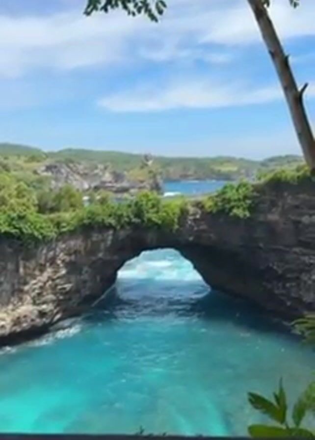 scenic view of a rock formation creating a natural archway over turquoise water. Lush green vegetation covers the top of the rocks. In the distance, other rocky formations and trees can be seen under a blue sky with scattered clouds. The camera is relatively still, focusing on the natural bridge. The sound of voices can be heard in the background.