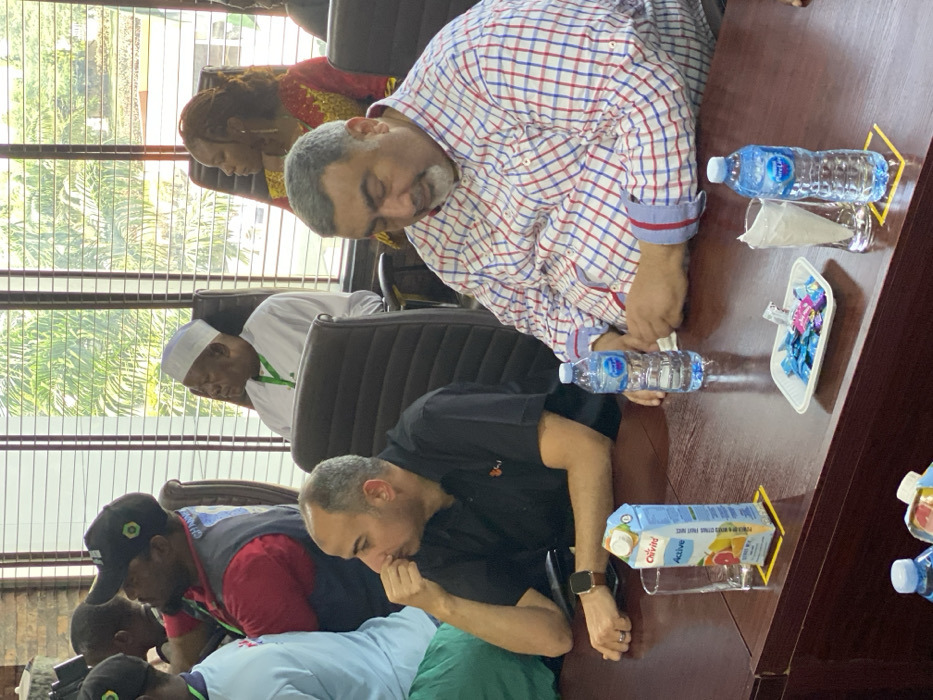 The image depicts an indoor meeting scene in Gwagwada, Nigeria, where multiple individuals are seated around a large, polished dark brown wooden table