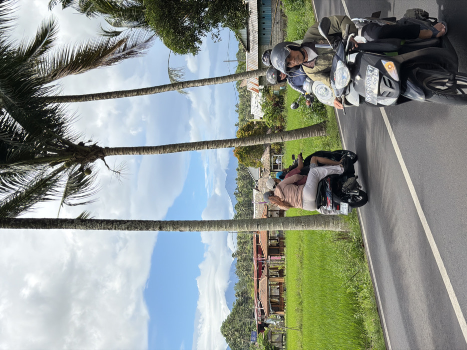 A tropical landscape features lush green rice paddies and traditional dwellings under a partly cloudy sky. Two motorbikes travel down a road lined with tall palm trees. One motorbike carries a driver and two passengers, while the other holds three people. Each rider wears a helmet. The landscape suggests a rural, possibly agricultural setting in a tropical climate.
