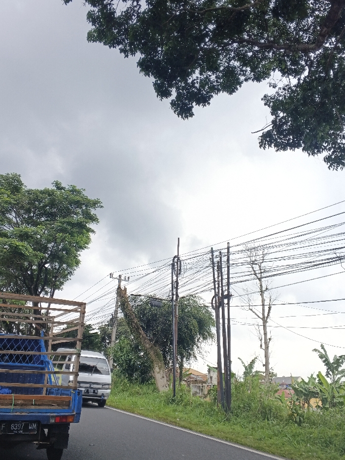 The scene is an outdoor view in the city of Kalipayan, Philippines, depicting a road under an overcast, light gray sky. In the lower-left foreground, the rear of a blue pickup truck with a wooden slatted cargo bed is visible, bearing license plate "F 8397 WM". Ahead of this truck on the asphalt road, a white van is oriented away from the viewer, its front visible, with a partially obscured license plate "D 9... BG". A white line delineates the right edge of the asphalt road, which is bordered by a grassy shoulder. Prominent in the midground is extensive utility infrastructure. Numerous utility poles, including one appearing to be a tree trunk adapted for utility use, are heavily strung with multiple overhead wires. A cluster of several dark, slender utility poles also bears extensive wiring on the right side of the road. Dense vegetation characterizes the environment. Large trees with green foliage partially frame the top of the image, and additional greenery lines the roadside. In the mid-right, banana plants are visible alongside two tall, defoliated trees. Faint building structures, likely residential, are discernible in the distant background, partially obscured by vegetation. No individuals are visible.