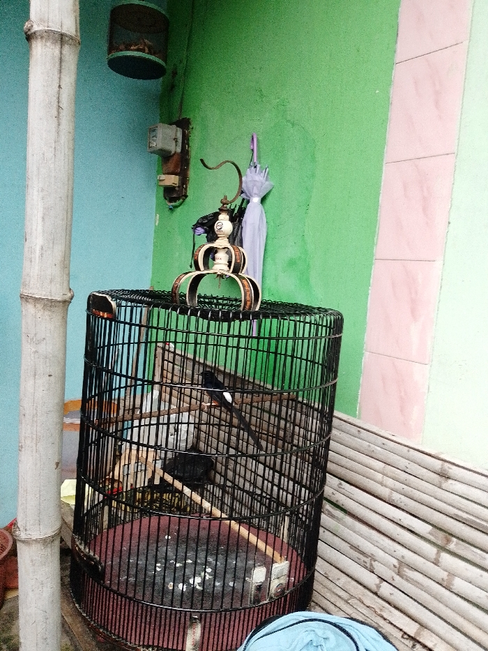 - "The image displays an outdoor or semi-outdoor scene in Kecamatan Pati, Indonesia, focusing on a black, cylindrical metal birdcage positioned centrally in the foreground" by FM-BBWcp1, licensed under CC BY 4.0