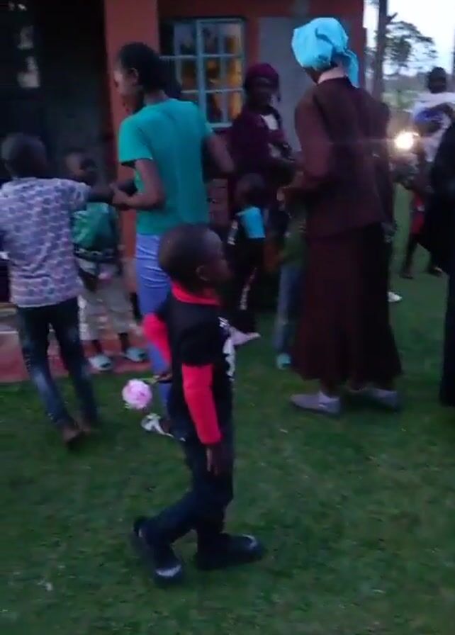 group of people, including adults and children, standing on a grassy area outside of a building. Most of the people are holding white plates, possibly containing food. There are at least 10 people in view. The video appears to be taken from a low angle, capturing the scene from the perspective of someone standing among the group. The building has a light-colored exterior with a dark door and window frames. The overall lighting suggests it is either dusk or dawn. Some of the people are interacting with each other. A young boy in a black shirt with a red undershirt is standing prominently in the foreground, looking at the camera.