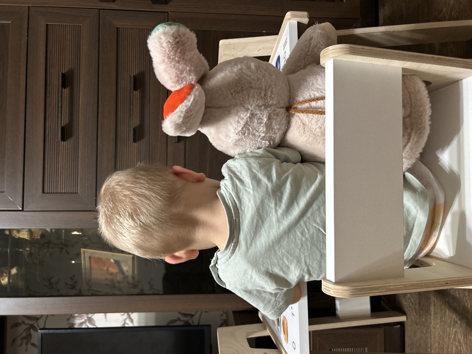 A young child with blonde hair, viewed from the back, is seated in a white and light wood chair at a small white table in a domestic interior in Voskresensk, Russia