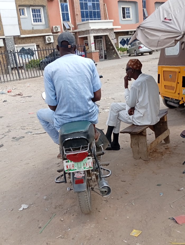 The scene depicts an outdoor urban environment in Sabon Gari East, Nigeria. In the foreground, a male individual is seated on a black motorcycle with a green seat, facing away from the camera. He wears a light blue short-sleeved top, light blue pants, and a dark baseball cap worn backward. The motorcycle features chrome rear fender guards and a visible Nigerian license plate reading "KUR 11 AYI." To the right, another male individual sits on a rustic wooden bench, facing left. He is dressed in a white long-sleeved top, white pants, and a patterned brown and gold cap, with dark sunglasses. His right hand rests near his chin. The ground is unpaved, consisting of dry, light brown soil with scattered debris, including small pieces of paper and a green stick-like object. In the mid-ground right, a portion of a yellow and brown auto-rickshaw (Keke Napep) with a beige canopy is visible. The background features several multi-story buildings. A prominent building has an orange/peach facade with large, blue-tinted windows and air conditioning units mounted externally. Another building appears grey/light brown with multiple windows. A black metal fence separates the unpaved area from a property containing a dark sedan. Further in the background, a silver car is parked. A third individual, wearing a yellow top, is partially visible in a doorway of one of the background buildings.