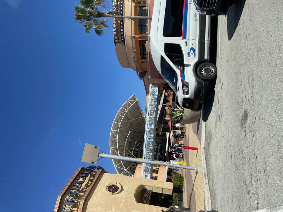 A white Ford Transit van, marked with "TA" and a wheelchair symbol, is parked near a building with "Texas Churrascaria" visible. The sky is bright blue. The entrance to the Dolphin Mall is apparent, marked with its name in large letters. People are visible under the mall's awning. A lamp post and a circular structure are notable features.