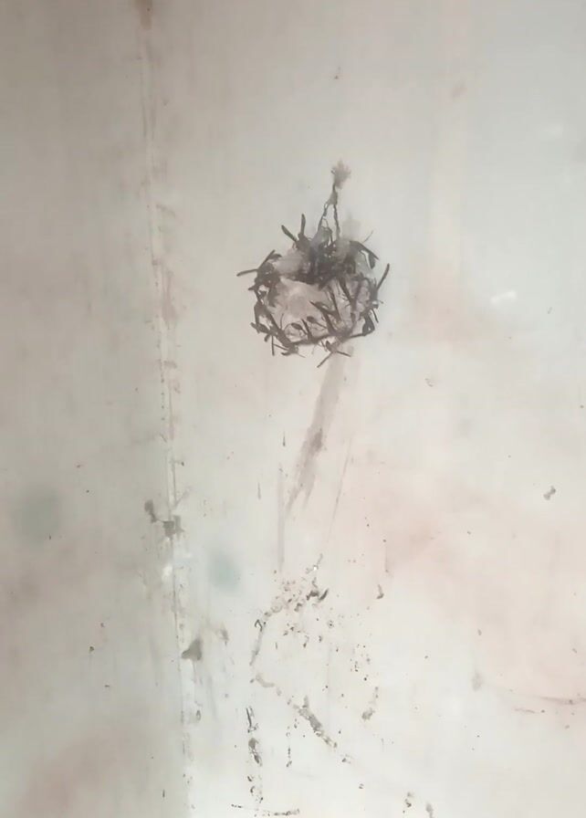 A close-up shot captures two small clusters affixed to a white surface. Each cluster appears to be composed of fine, dark, thread-like structures mixed with bits of white, possibly cotton or similar material. The surface beneath these clusters is marked with a pattern of dark smudges and streaks. The overall impression is one of collected debris or possibly the beginnings of a tiny nest or web. The lighting is somewhat diffused, contributing to the soft appearance of the scene.