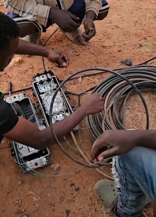 Three men are working on fiber optic cables. They are outside, kneeling or sitting on the ground, which appears to be a reddish-brown dirt. In front of them are two open black boxes containing wires and other components. A large coil of black cable lies nearby. The men are dark-skinned and are wearing casual clothing, including jeans, sandals, and plaid shirts. One of the men is looking at his phone, which displays an app with a red icon. They appear to be connecting or repairing the fiber optic cables.