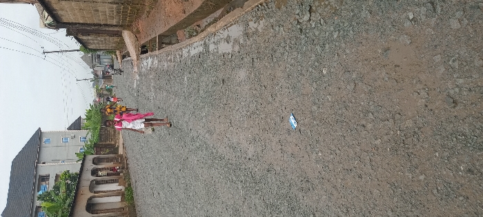 A slightly angled street scene shows a rough, unpaved road surface of dirt and gravel