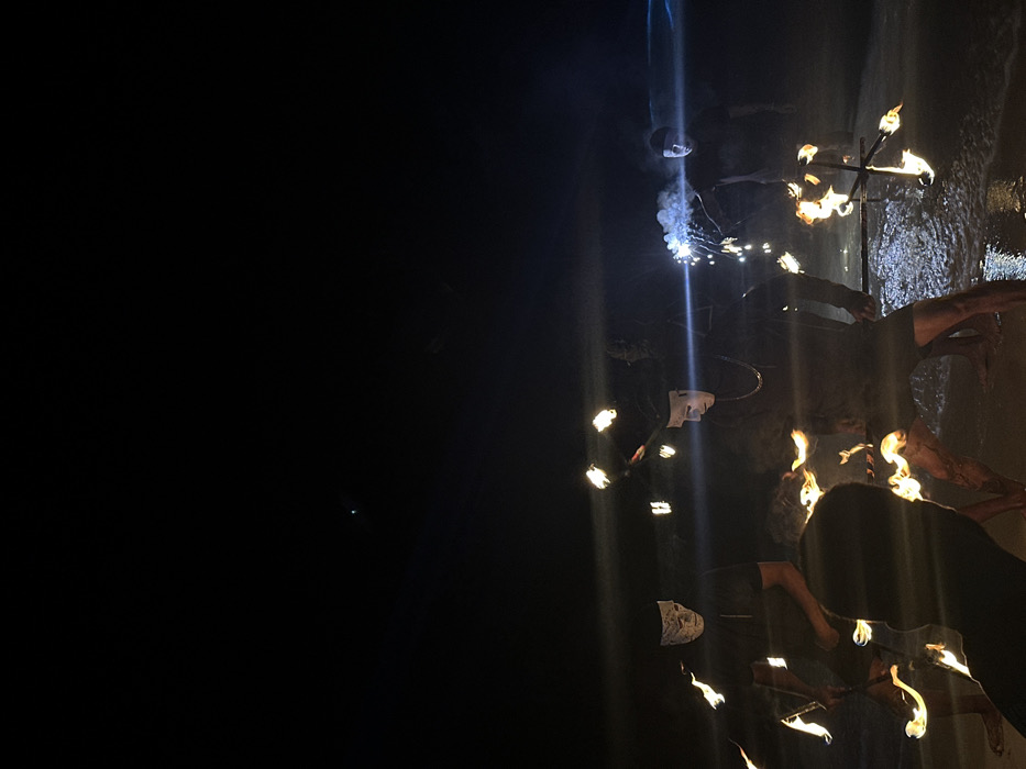 The image captures a dark, possibly nighttime scene with a group of fire performers