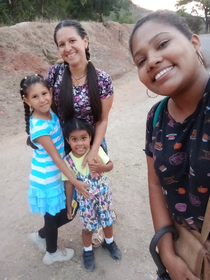Four individuals are captured in an outdoor photograph on an unpaved dirt path in Sabaneta, Venezuela. The group consists of three females and one younger child. From right to left: 1. An adult female, positioned in the foreground and appearing to hold the camera, exhibits a dark skin tone and dark hair. She smiles directly at the camera, displaying teeth, and wears a dark, short-sleeved top with various colorful patterns. A gold-colored hoop earring is visible on her right ear, and a green backpack strap crosses her left shoulder. A light brown bag is partially visible on her right side. 2. An adult female, standing in the mid-ground, has a light-medium skin tone and long dark hair styled in two pigtail braids. She smiles directly at the camera, revealing teeth, and wears a dark, floral-patterned short-sleeved top. A dark necklace with a gold-colored cross pendant is visible. Her left arm is placed around the shoulder of the taller child next to her. 3. A young female child, positioned to the left, has a light skin tone and dark hair styled in two pigtail braids. She smiles at the camera, wearing a light blue and white horizontally striped dress with a ruffled skirt, black leggings, and light-colored sneakers. Her right arm is positioned around the waist of the smaller child beside her. 4. A younger female child, situated in the center-bottom, has a dark skin tone and dark hair. She smiles at the camera, wearing a light yellow short-sleeved top beneath colorful Mickey Mouse-themed overalls, dark shoes, and white socks. Her left arm is around the waist of the taller child, and her right hand rests on the taller child's hip. All subjects are smiling and looking towards the camera, indicating a posed group shot. The ground is an unpaved, light brown dirt path. The background features a sloped, uncultivated hillside with exposed reddish-brown soil and sparse dry vegetation, transitioning to distant trees and a lighter sky on the right. The scene is illuminated by natural daylight.