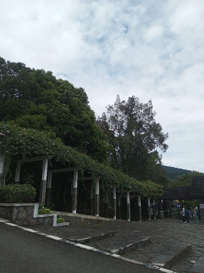 A cloudy day illuminates a scene featuring a stone pathway leading towards an arbor structure covered with lush green vines and flowering plants. A large tree stands behind the arbor, contributing to the verdant foliage. People are visible near a building at the far end. The foreground shows an asphalt road and stone steps, suggesting a transition from pavement to the nature-integrated entrance.