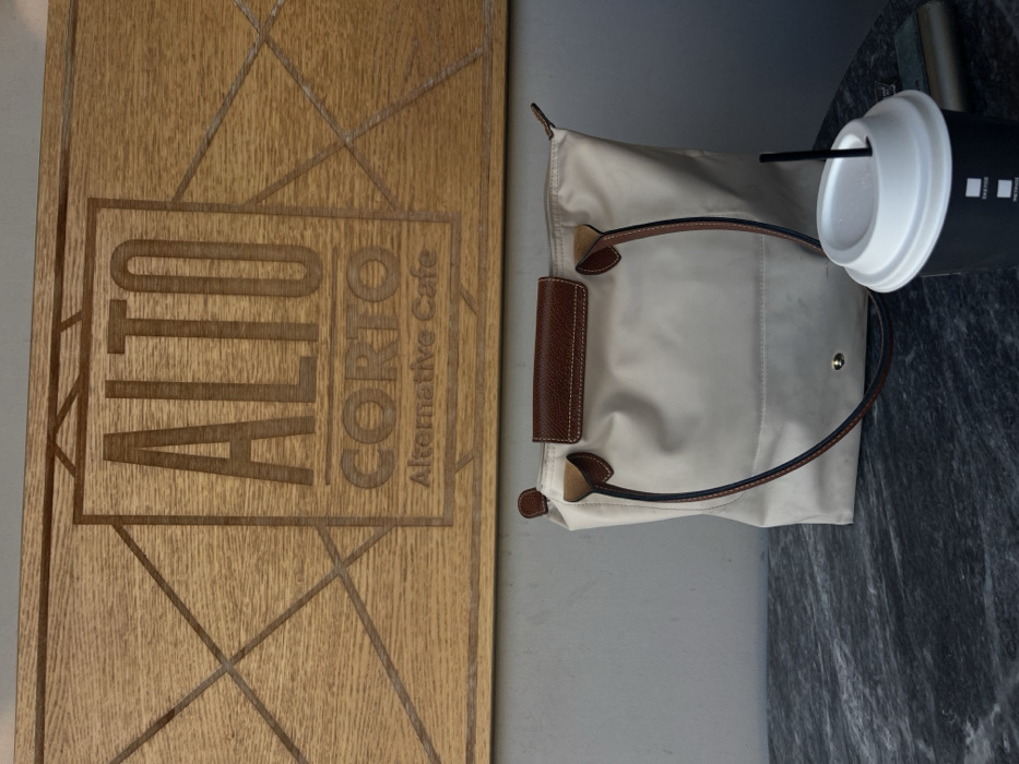 An indoor scene at Alto Corto Alternative Cafe, located at G. Papadopoulou 1, Agia Paraskevi, Greece. A rectangular wooden sign with the engraved text "ALTO CORTO Alternative Cafe" is mounted on a light grey wall, occupying the upper portion of the frame. Below the sign and wall, a dark grey marble-patterned tabletop is visible. On this tabletop, a light beige nylon tote bag with brown leather trim and handles rests to the left. To its right, a black disposable coffee cup with a white lid and a black straw is positioned. A metallic object is partially visible behind the coffee cup to the right. No people are depicted.