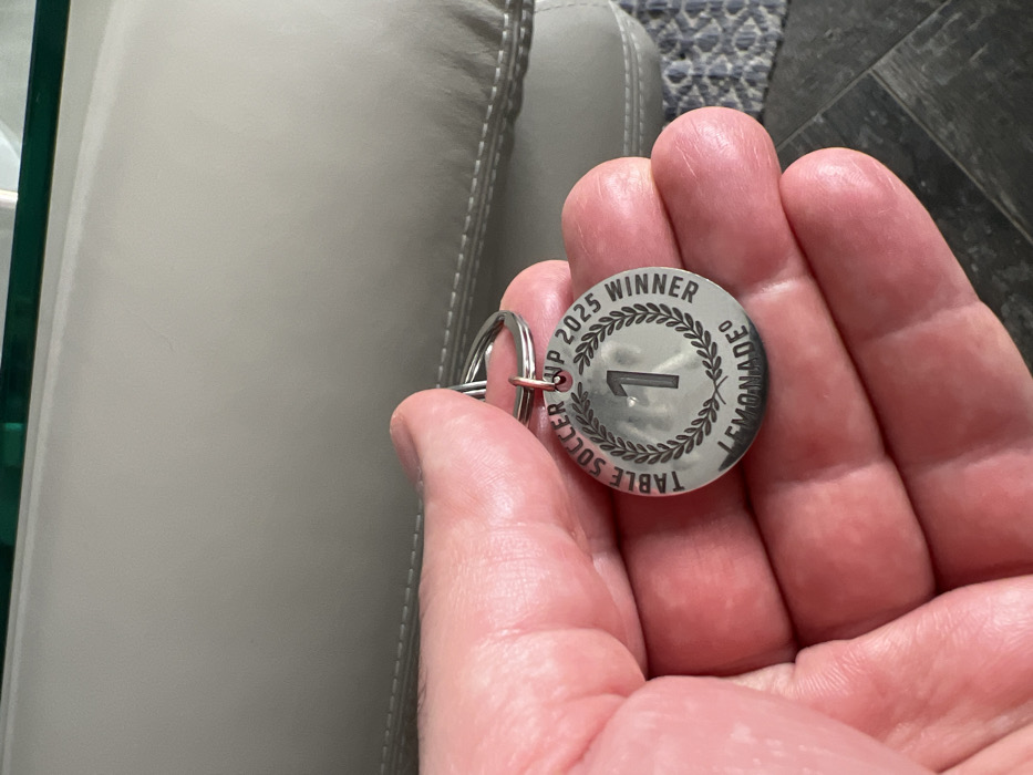 The image displays a close-up of a human hand holding a circular, silver-colored metal keychain or medal. This scene is located in Rafailovići, Montenegro. The medal is engraved with "TABLE SOCCER CUP 2025 WINNER" positioned along the upper and right circumference, a large numeral "1" centrally located within a laurel wreath design, and "LEMONADE°" along the lower circumference. The medal is attached to a standard metal keyring by a small, copper-toned connecting ring. The background consists of a light gray upholstered surface, likely a piece of furniture, with a visible horizontal seam. Above this, a segment of a transparent, green-tinted surface is present. A dark gray patterned surface is partially visible beneath the hand.