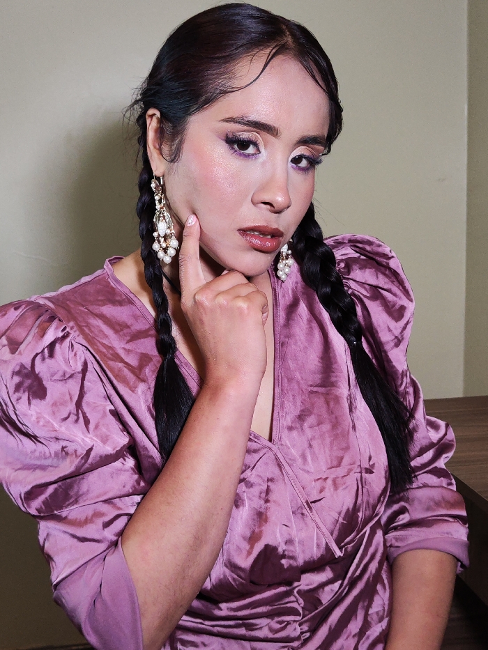 A woman with braided dark hair and purple eyeshadow poses in front of a wall. She wears large, ornate earrings and a shiny, mauve-colored blouse with puffed sleeves. Her right hand is raised, with her index finger touching her cheek in a contemplative gesture. She has a slight frown and is looking directly at the camera. A portion of a wooden surface is visible in the bottom right corner.
