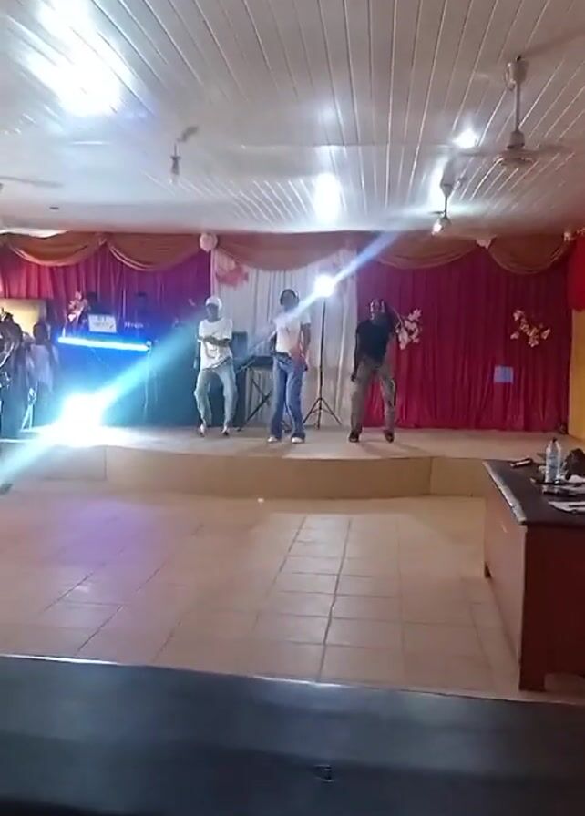 Three people dance on a small stage in front of a red and gold curtain. One person wears a white shirt and jeans with a white hat, one person wears a white shirt with wide-leg jeans and a pink waist bag, and one person wears a black shirt and patterned cargo pants. There is a DJ behind them with blue lights. There is a table with drinks on it to the right of the stage. The ceiling has white panels and two ceiling fans. The floor is made of light tiles. The camera slowly pans from the floor to focus on the stage.