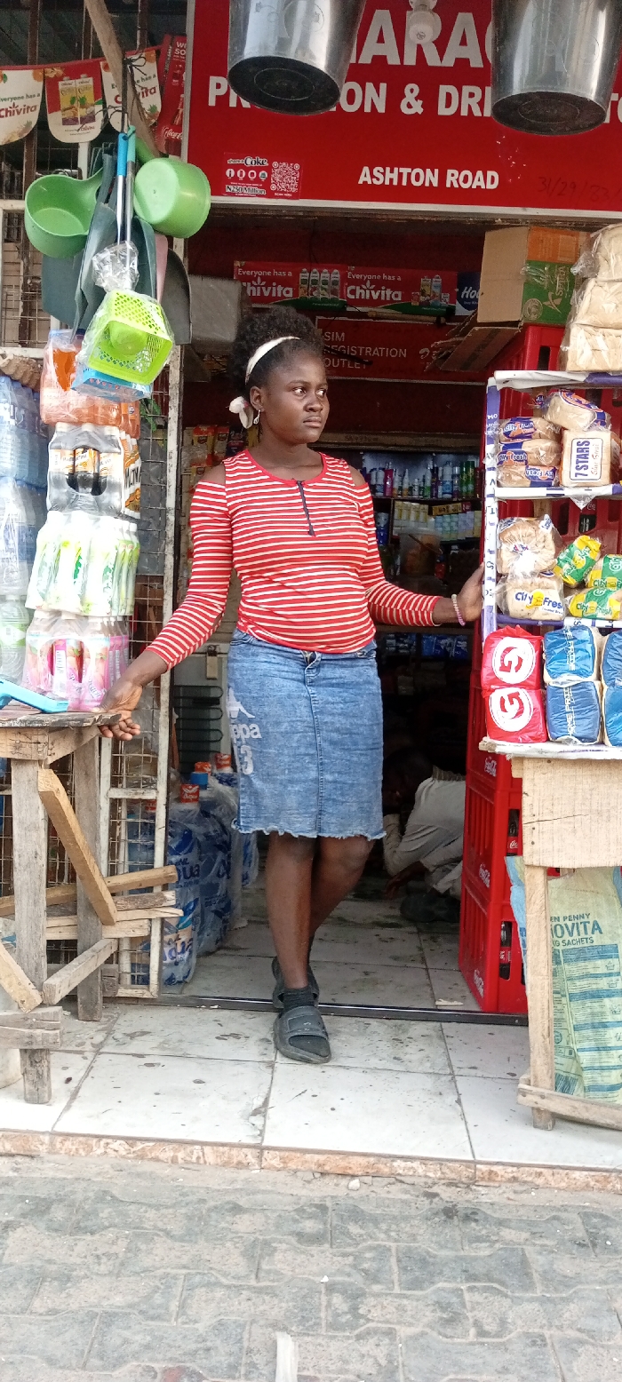 A woman stands at the entrance of a small store. She wears a red and white striped shirt, a blue denim skirt, and sandals. The store sells beverages, bread, and other goods. A sign above reads "GARAGE P & DR ASHTON ROAD," and a Coca-Cola advertisement is visible. The entrance is cluttered with buckets, containers, and wooden supports. A SIM registration outlet sign is also present.