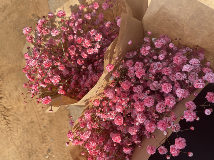 Two bouquets of small, vibrant pink flowers, consistent with dyed Gypsophila, are displayed