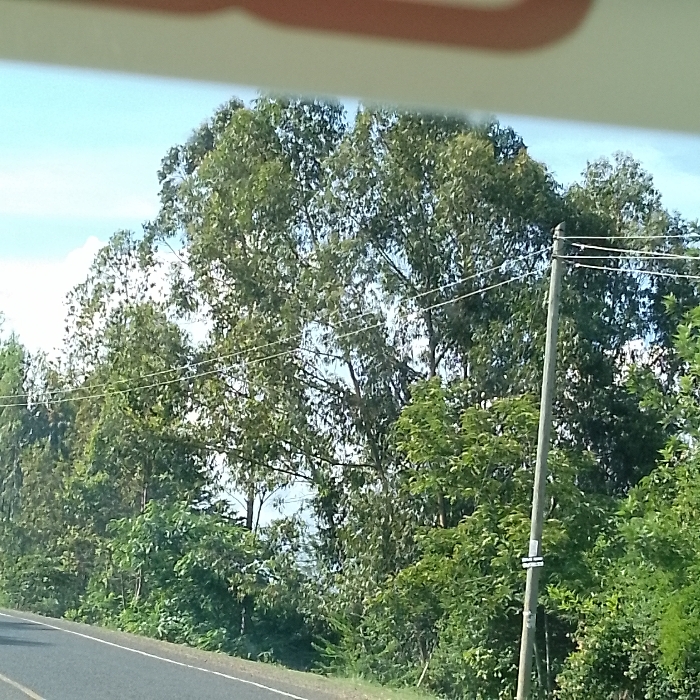 The image captures a roadside scene in Kola ward, Kenya, under a clear sky with scattered white clouds. A dark asphalt road, bordered by a white line on its right edge, is visible in the lower left quadrant. The right side of the road and the background are dominated by dense green vegetation, comprising numerous trees of varying heights and bushy undergrowth. A light-colored wooden utility pole stands vertically on the right, emerging from the foliage. Three thin, dark utility lines are strung horizontally across the upper middle of the frame, connected to the pole. A small, white rectangular label with two horizontal black markings is affixed to the utility pole at mid-height. No people, animals, or active vehicles are present in the visible portion of the scene. The top edge of the image shows blurred reddish-brown and white elements, consistent with a vehicle's interior frame.