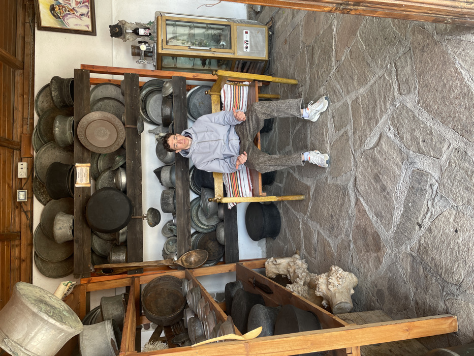 A young male is seated centrally on a wooden bench within a rustic interior exhibit space in Skobelevo, Bulgaria. He wears a light grey hooded zipper jacket, patterned brown trousers, white socks, and white athletic shoes, with his hands resting on his lap. The floor is paved with irregularly shaped flagstones. The walls are densely covered with wooden shelves displaying an extensive collection of aged metalware. To the left, a vertical shelving unit features numerous tarnished metal pots, pans, and cylindrical containers, including a large inverted pot suspended from above. Below these shelves, gnarled wooden roots and a dark, round object rest on the floor. Behind the individual, multiple horizontal shelves are packed with various metal items, predominantly circular basins, trays, and pots, many appearing to be tarnished copper, brass, or dark iron. Several items resembling traditional headwear are visible on upper shelves. A small, dark frying pan hangs from a hook on a central shelf, and a small informational sign is present above it. The ceiling consists of exposed wooden planks. To the right, a tall, narrow display cabinet with glass panels and a silver base showcases items such as bottles, including one of wine, and a miniature sewing machine. A bear figurine stands on top of the cabinet, and a colorful framed painting is mounted on the wall above it. A vertical wooden beam or door frame defines the right edge of the scene.