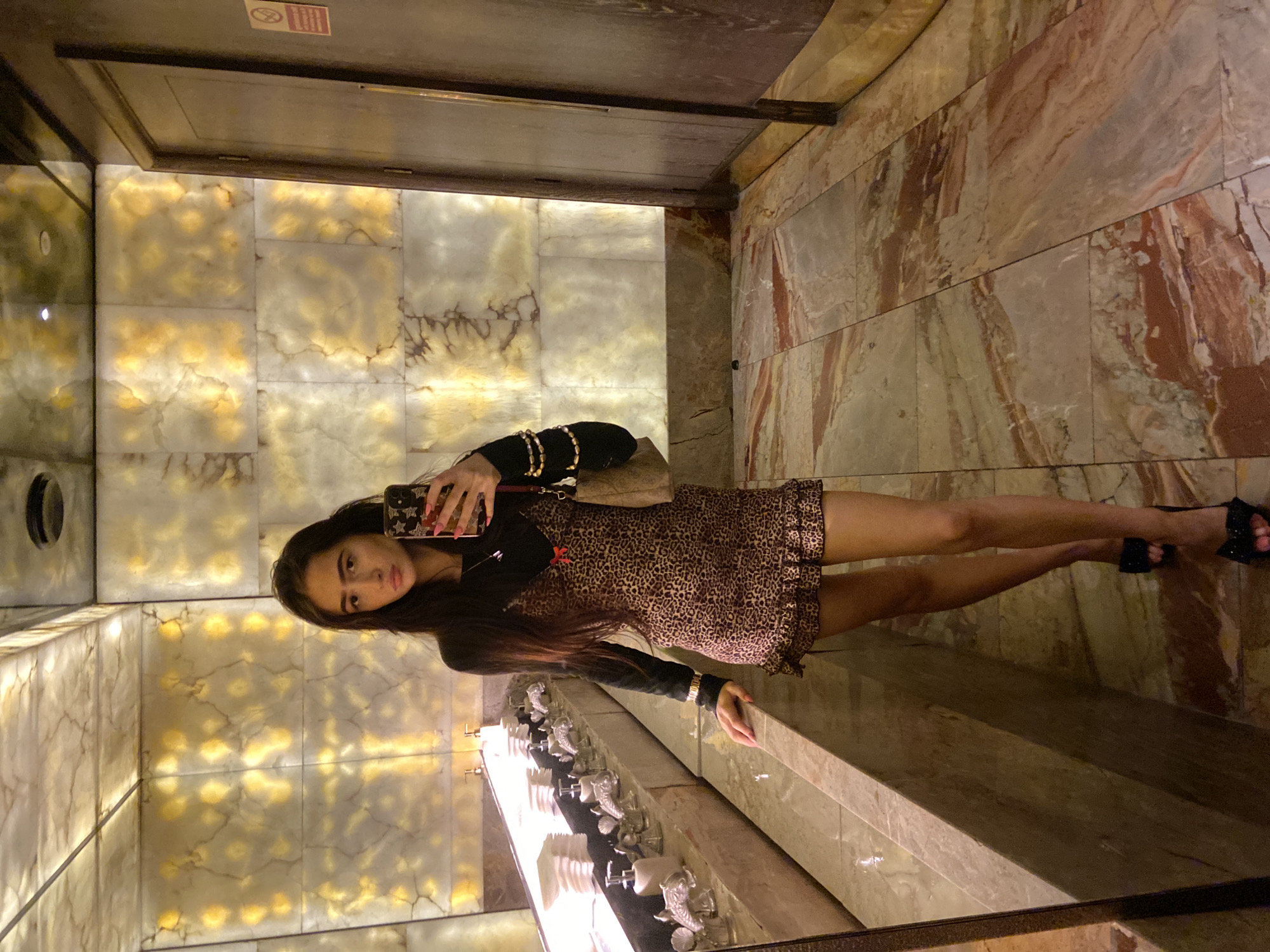 young woman taking a selfie in a restroom. She is wearing a brown leopard print dress, a black jacket, and black heels. She has long, dark hair and is holding a phone with a patterned case. The restroom has marble walls and countertops, with decorative faucets and recessed lighting. The location is possibly in the city of London, United Kingdom. There is a sign visible near the top of the image.