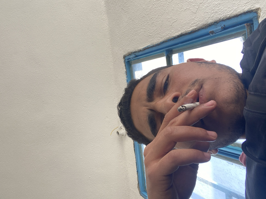A low-angle photograph taken in Dahiyat Harasta, Syria, captures a young adult male looking directly at the camera. The male subject has dark hair, dark eyes, and light facial hair. He is wearing dark apparel. His right hand holds a lit cigarette, with visible ash, between his index and middle fingers, positioned near his mouth. The background consists primarily of a white, textured wall or ceiling. A window with a distinct blue frame is visible behind and to the right of the subject, revealing a bright, indistinct exterior. Above and to the left of the subject's head, a small, white, cup-shaped electrical fixture with yellow wiring is attached to the wall/ceiling surface.